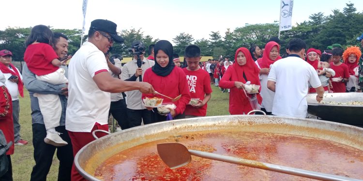 Ribuan porsi masakan yang dimasak dalam kuali super besar itu segera diserbu warga yang telah mengantre dengan tertib, Menu lezat yang disajikan menjadi hidangan utama di tengah padatnya perlombaan.